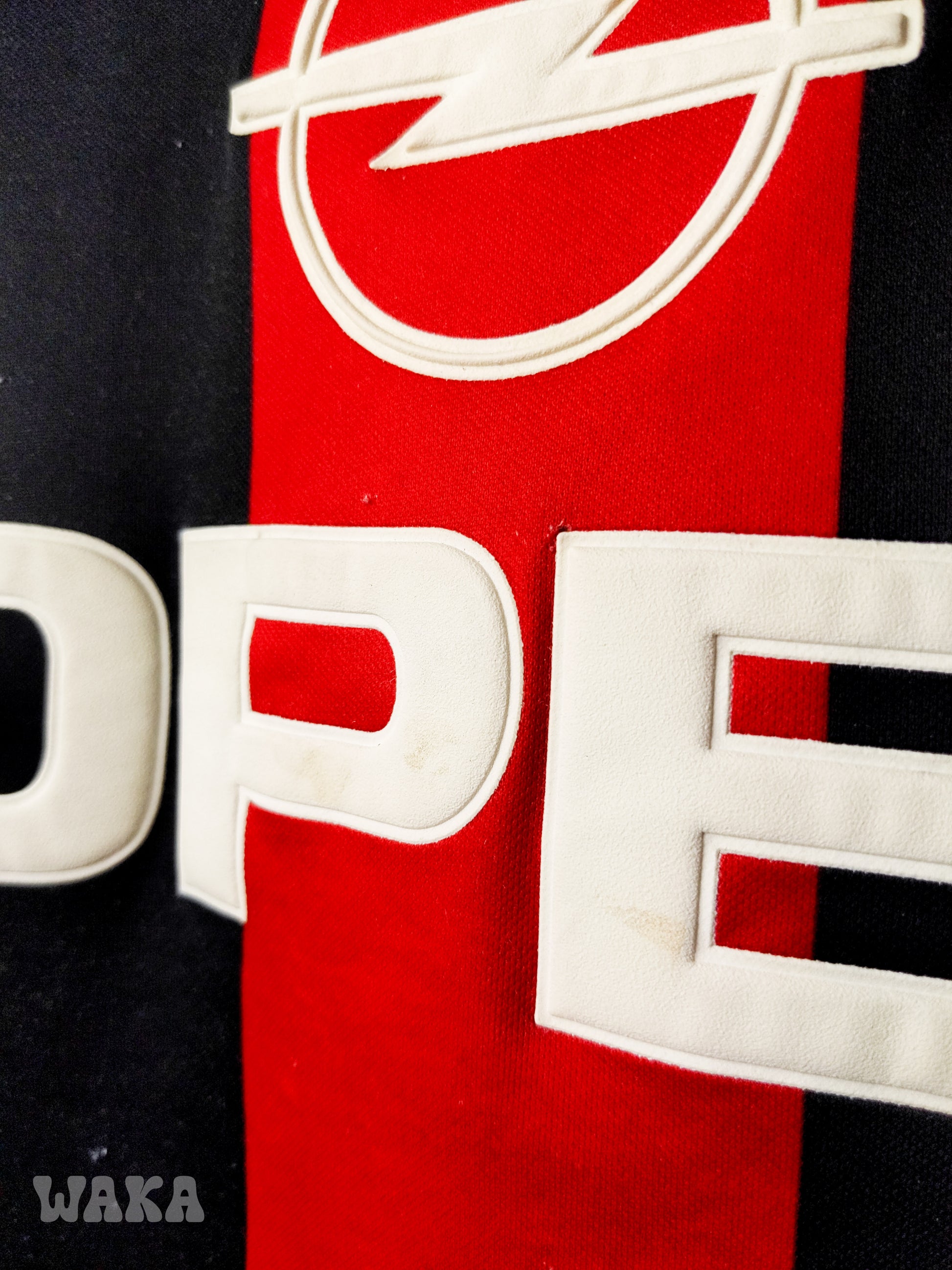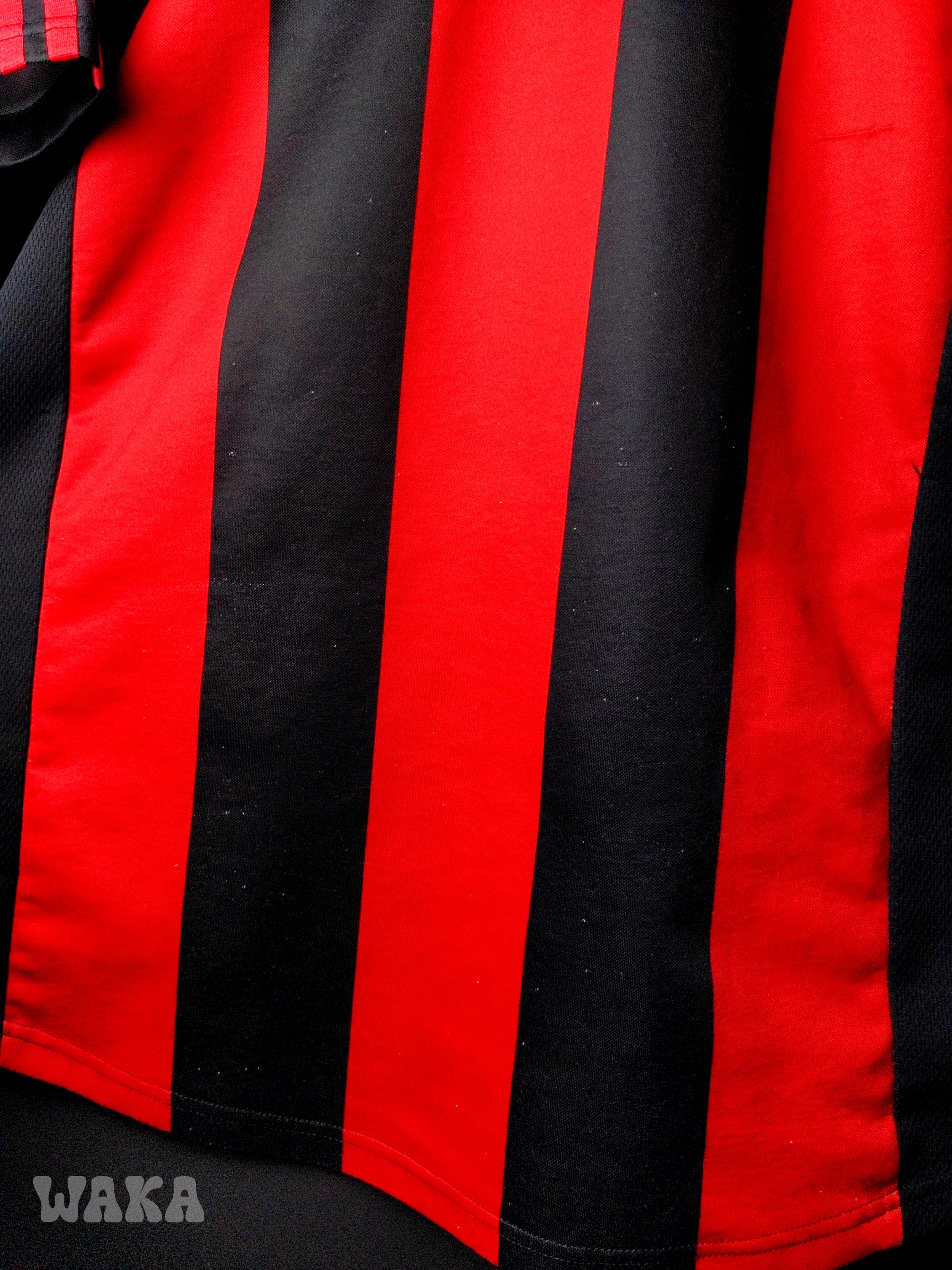 État : 5/10. Maillot bien abimé. Tissu avec énormément d'accrocs, sur l'avant comme sur l'arrière. Maillot parfait pour jouer au foot sans avoir peur de l'abimer.