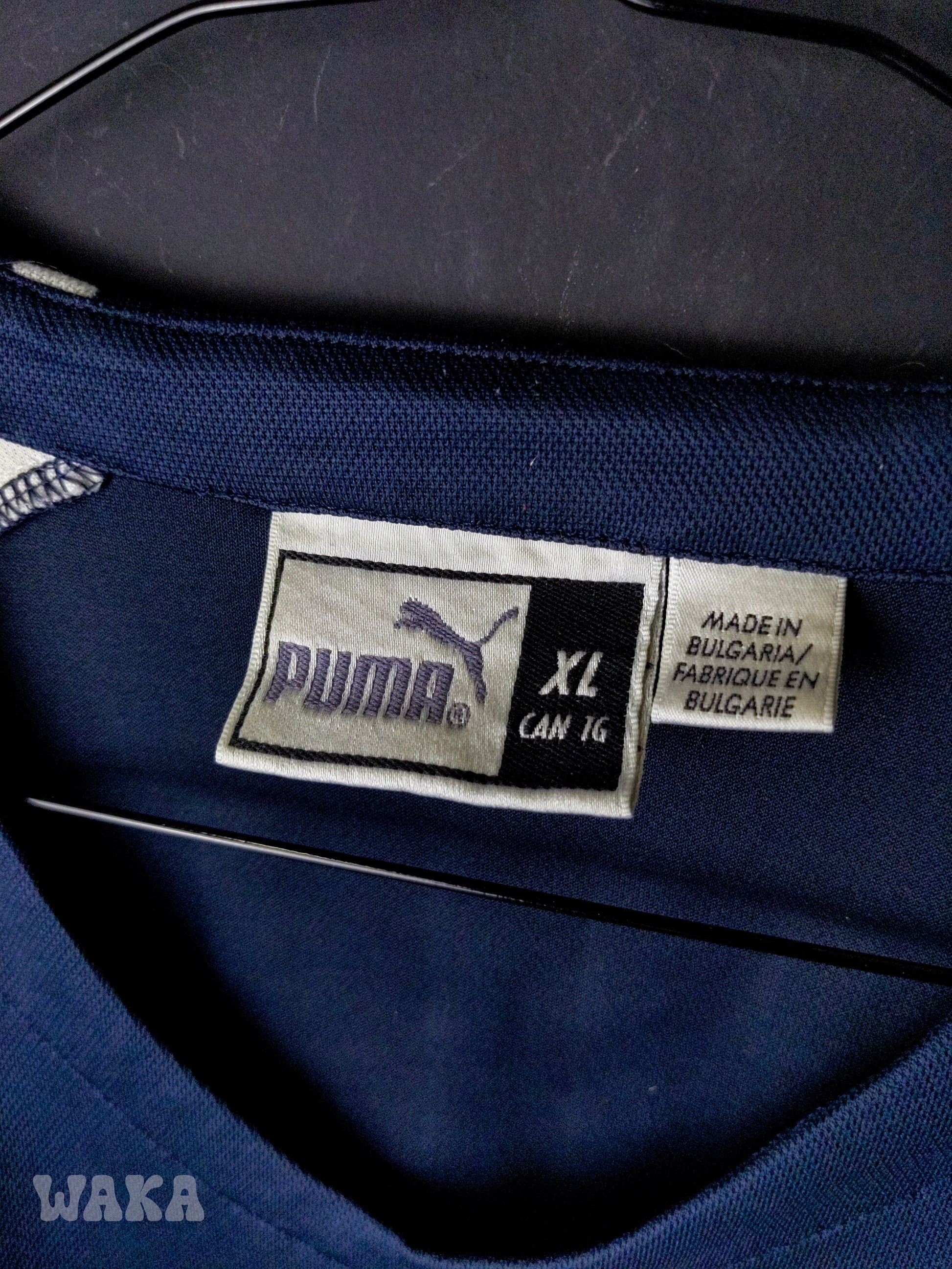 État : 6/10. Maillot avec de nombreux accrocs et fils tirés sur le tissu. Les éléments en feutrine ne sont pas abimés mais sont bien grisonnants.