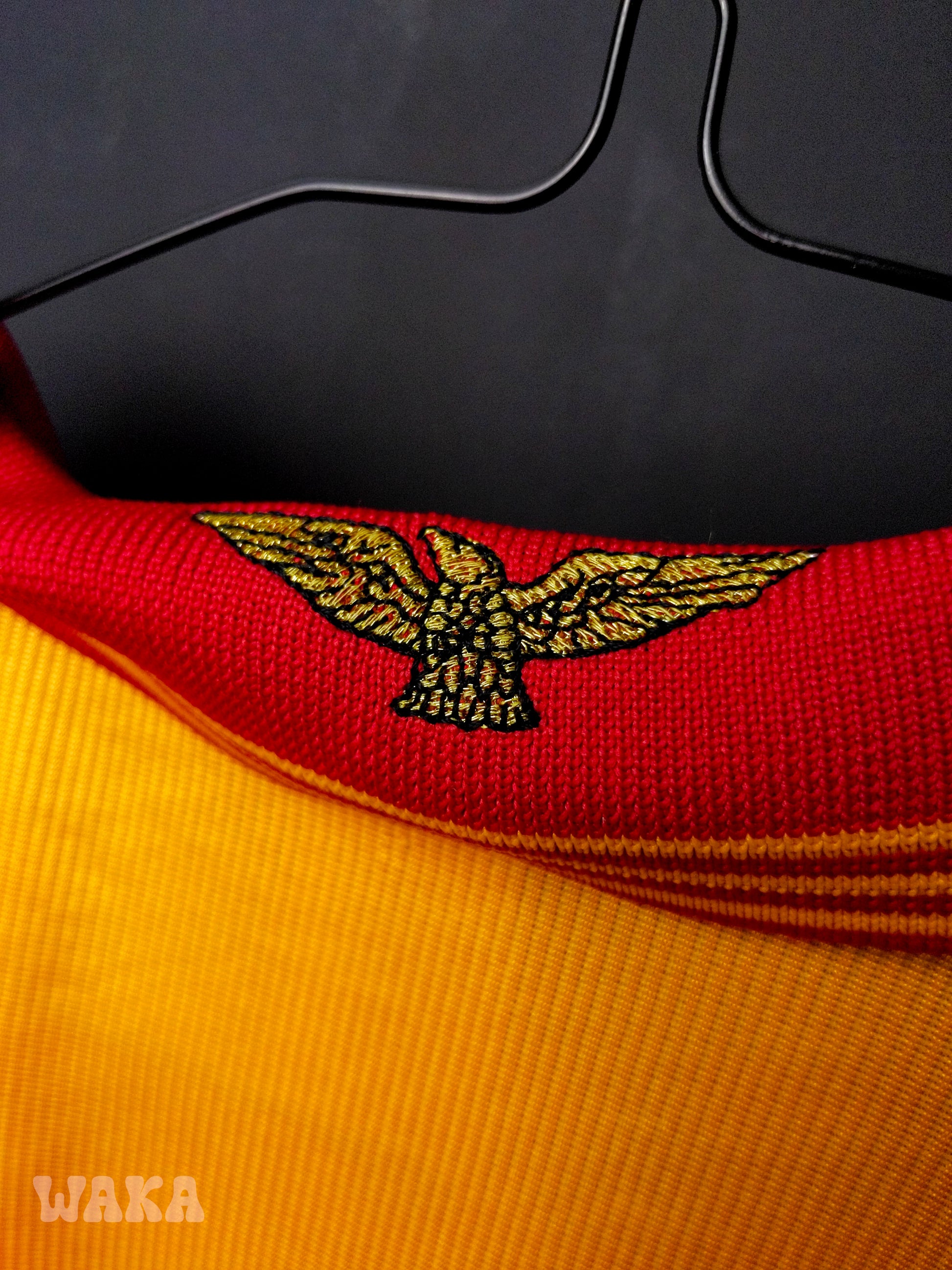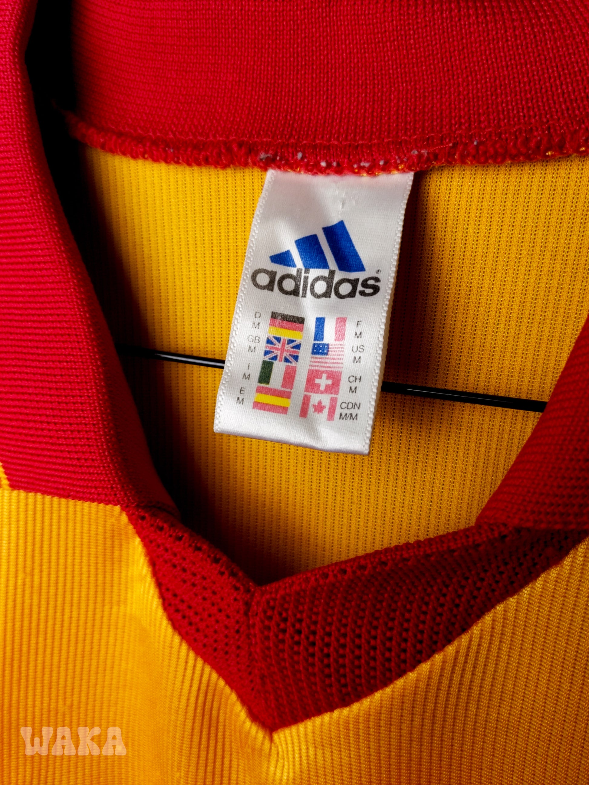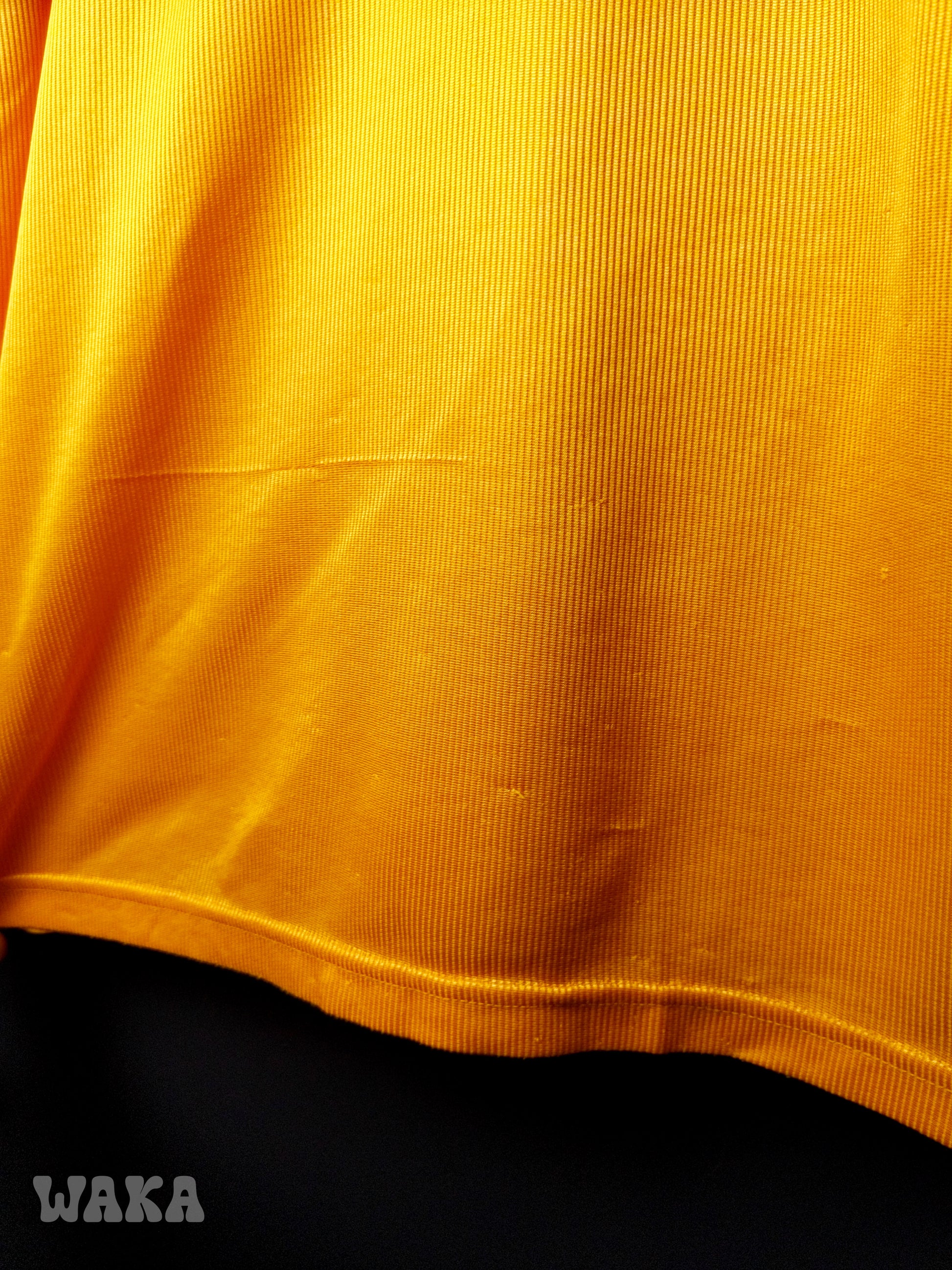 État : 6,5/10. Maillot avec beaucoup d'accrocs et de fils tirés sur le tissu. Le sponsor et les éléments brodés sont eux en très bon état.