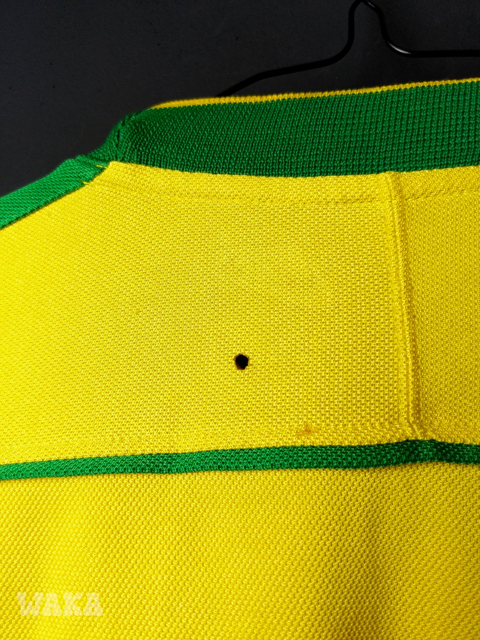État : 6/10 Maillot avec des grands fils tirés sur l'avant du maillot. Un trou assez important au niveau de la nuque, ce qui explique le prix réduit.