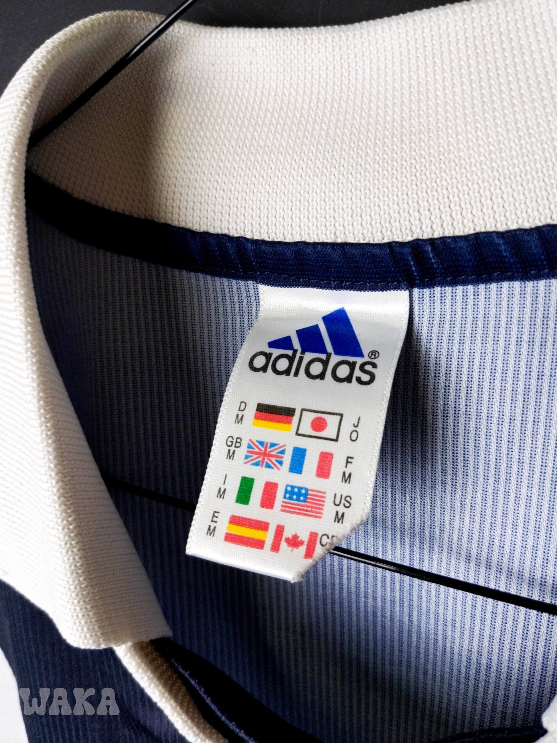 État : 8,5/10. Maillot en excellent état. tâches de la taille d'une tête d'épingle sur le col et le scapulaire. Léger défaut sur le tissu au niveau de l'arrière du bas du maillot.