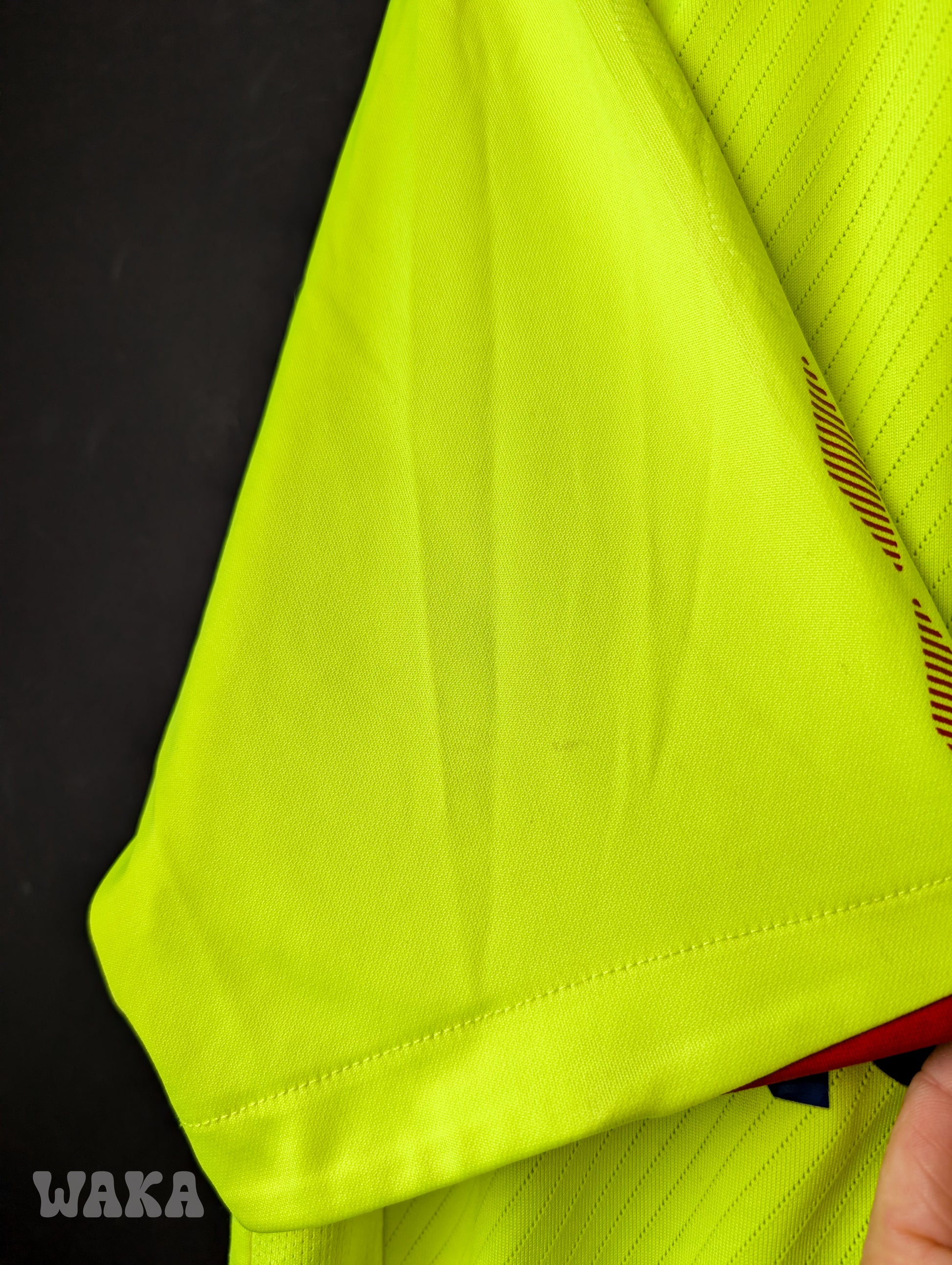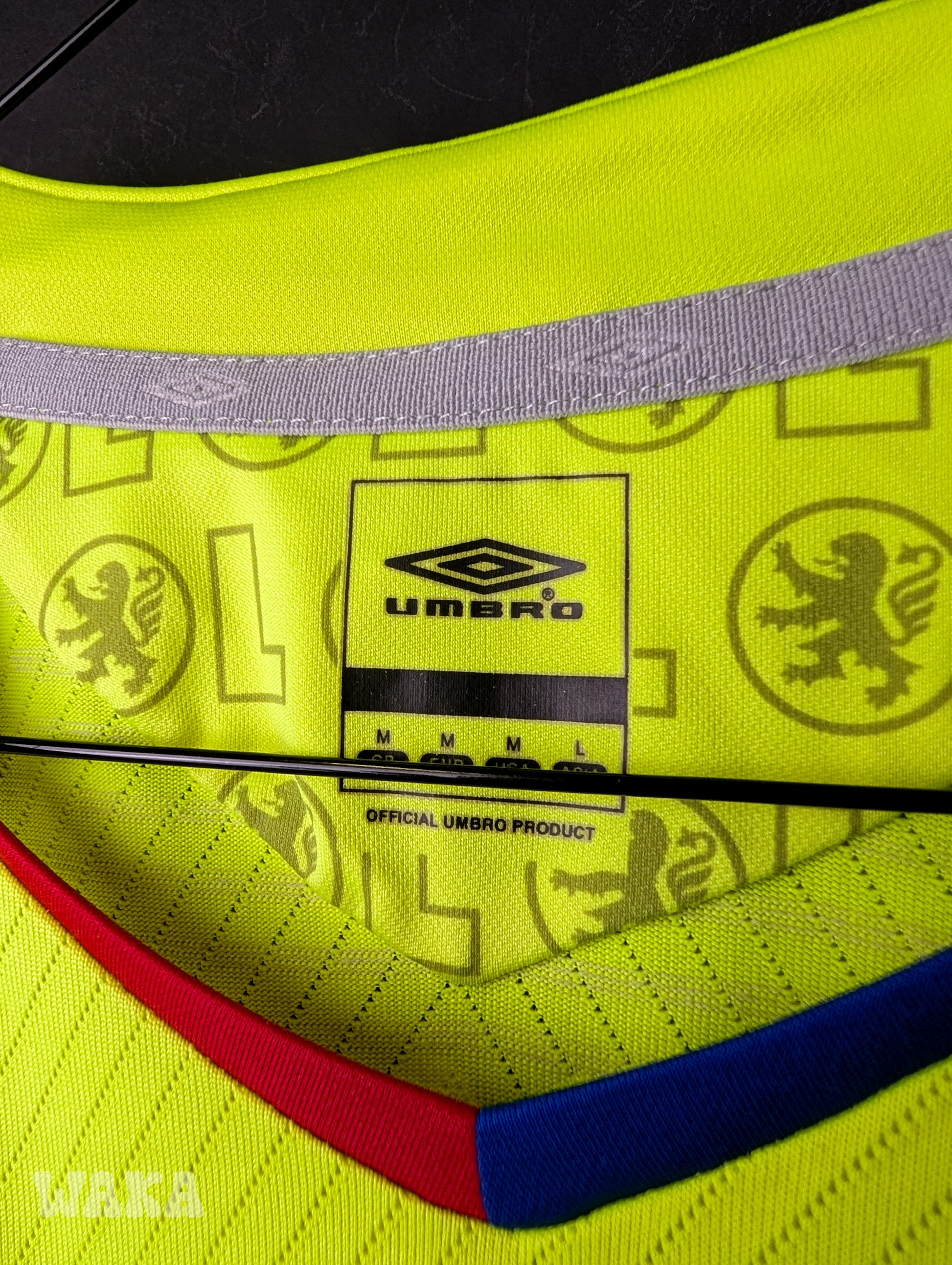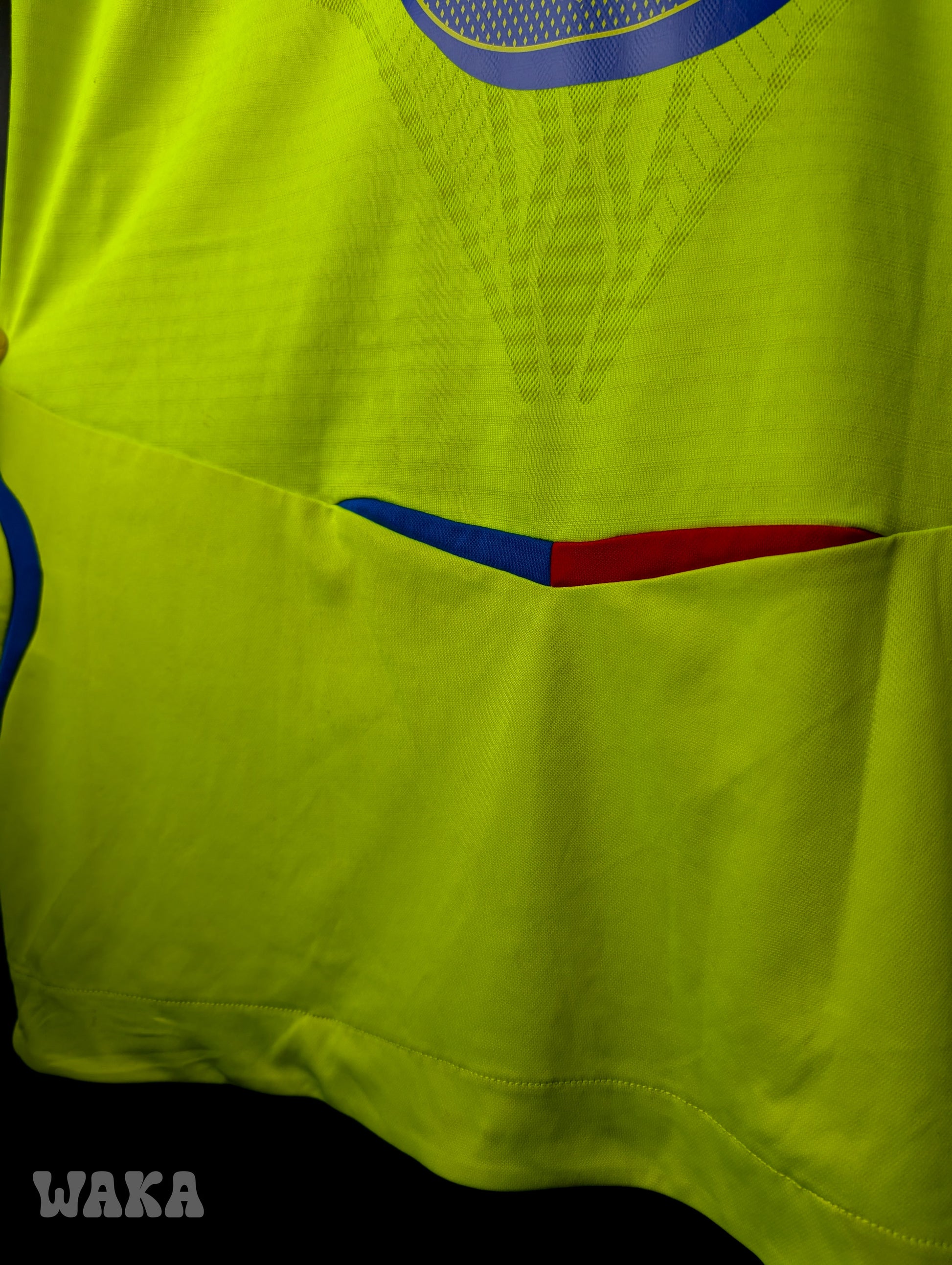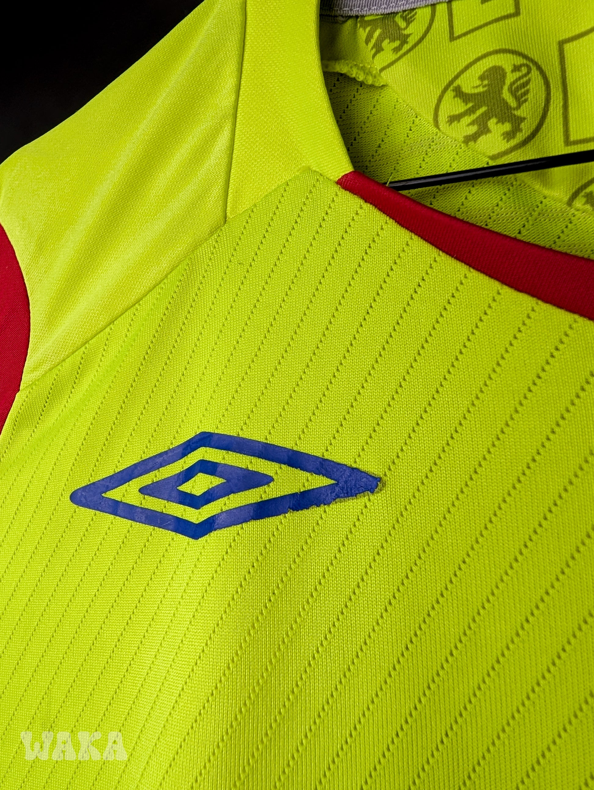État : 7.75/10. Maillot en bon état général. Plusieurs tâches et traces, voir photos. Les différents éléments floqués et brodés sont eux en excellent état. Pas non plus de trou ou d'accroc.