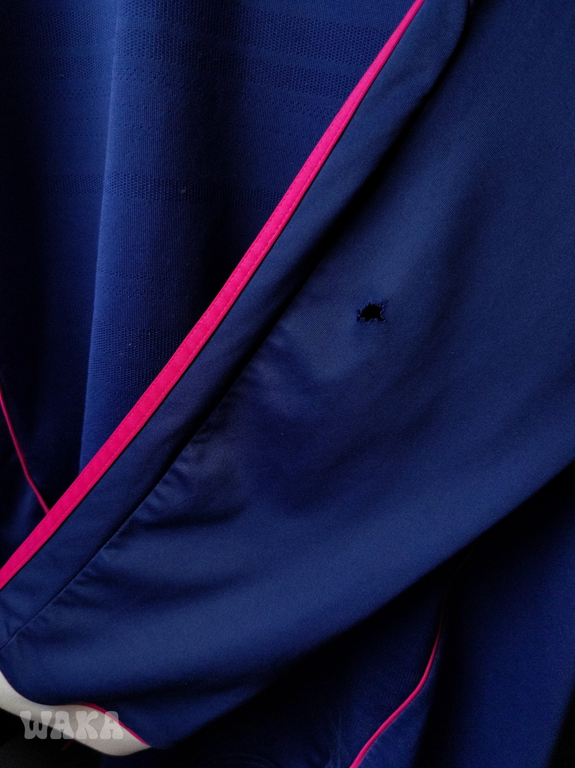 État : 8/10 Maillot en très bon état général. Trou assez important au niveau de l'arrière de l'avant bras gauche. Etiquettes coupées