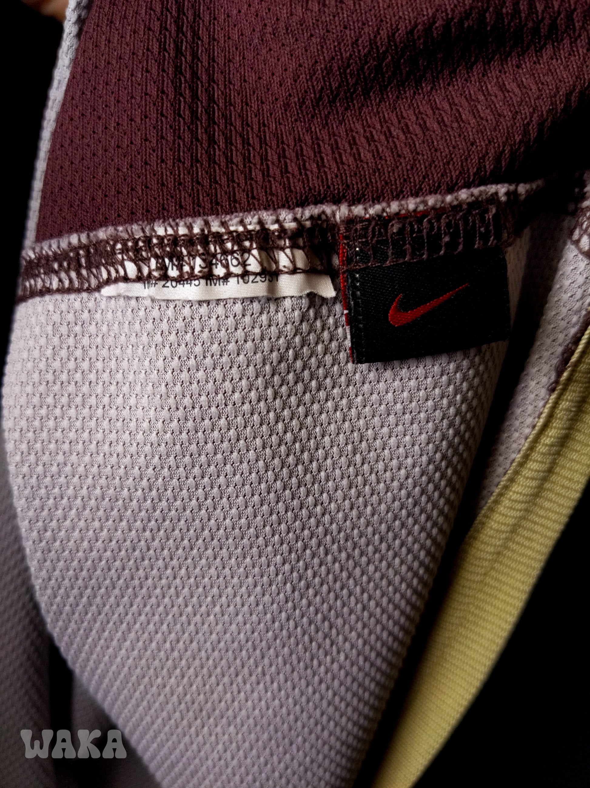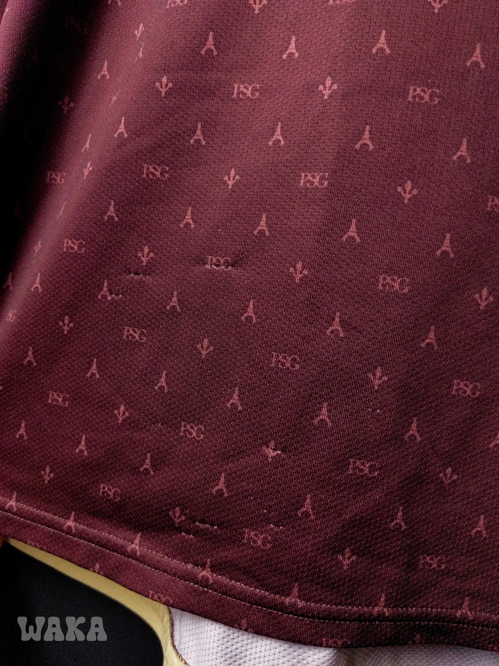 État : 9/10. Excellent état. L'étiquette de taille est effacée, et 3/4 légers accrocs tout en bas du maillot. Aucun autre défaut majeur à noter