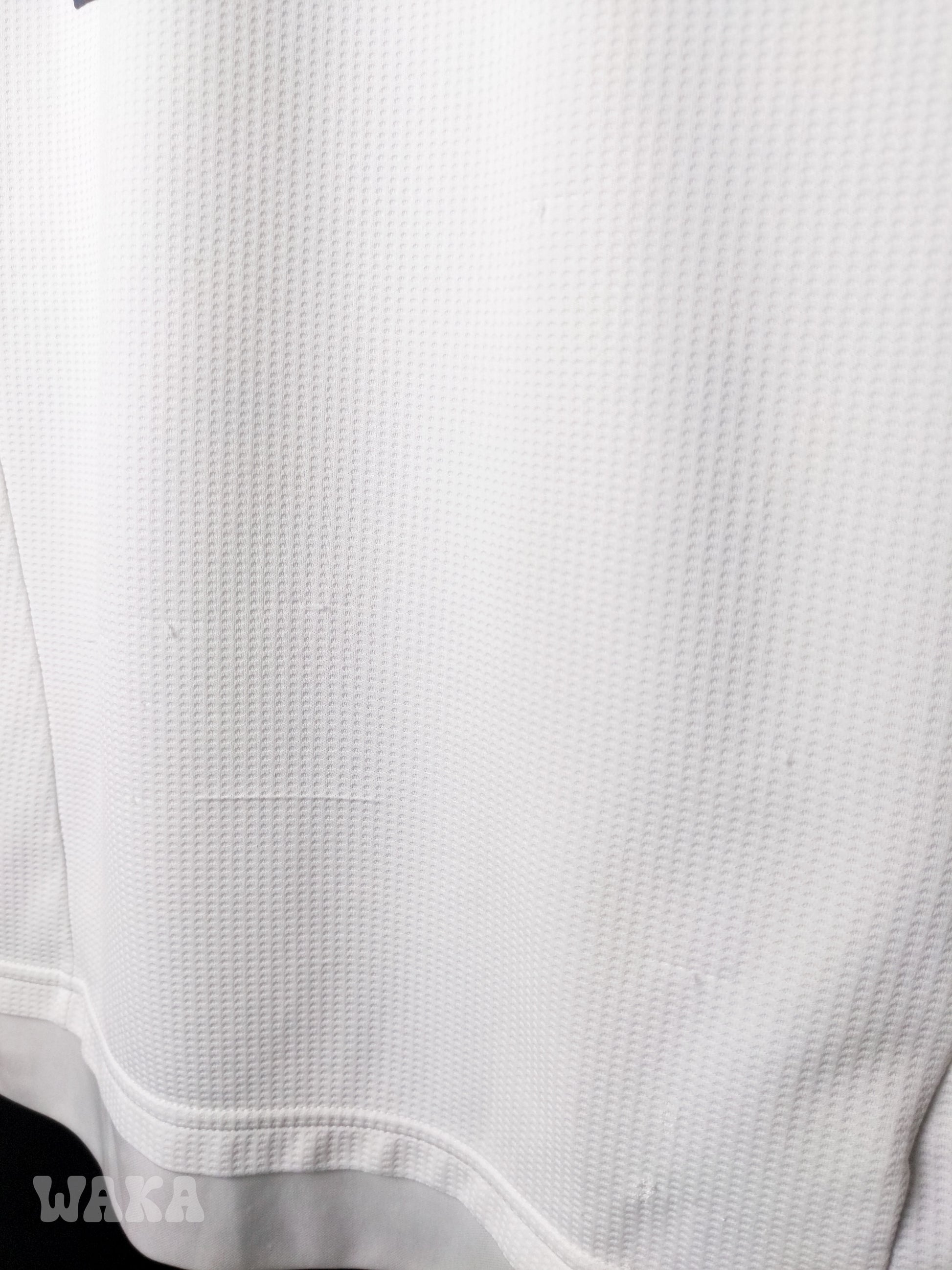 État : 7/10. Maillot en bon état. Quelques fils tirés au niveau du ventre, ainsi qu'une petite tâche de plâtre en bas.. Sponsor et écusson légèrement usés. Voir photo. L'aspect globale reste bon !